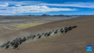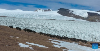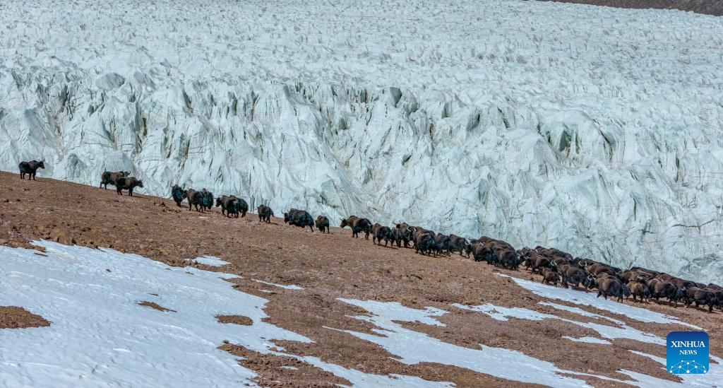 An aerial drone photo taken on March 10, 2026 shows a herd of wild yaks running near the Zangser Kangri Glacier at the Changtang National Nature Reserve, southwest China's Xizang Autonomous Region. March 21 marks the World Day for Glaciers. (Photo by Sonam Jamcan/Xinhua)