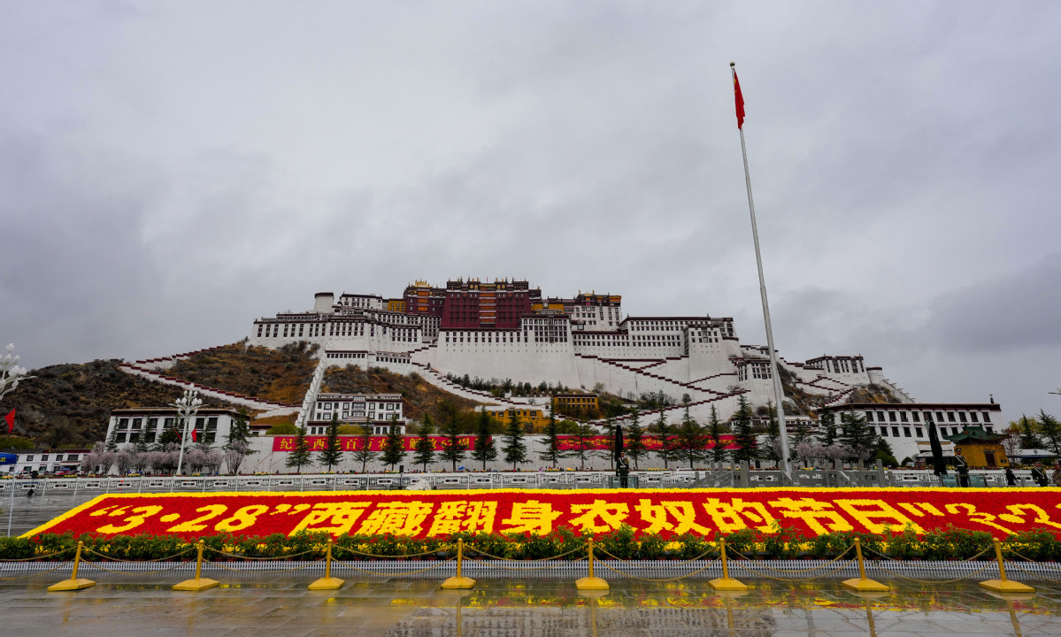 People from all walks of life attended a flag-raising ceremony at the Potala Palace Square in Lhasa, capital of the Xizang autonomous region, on Saturday morning, to mark the region's 18th Serfs Emancipation Day.