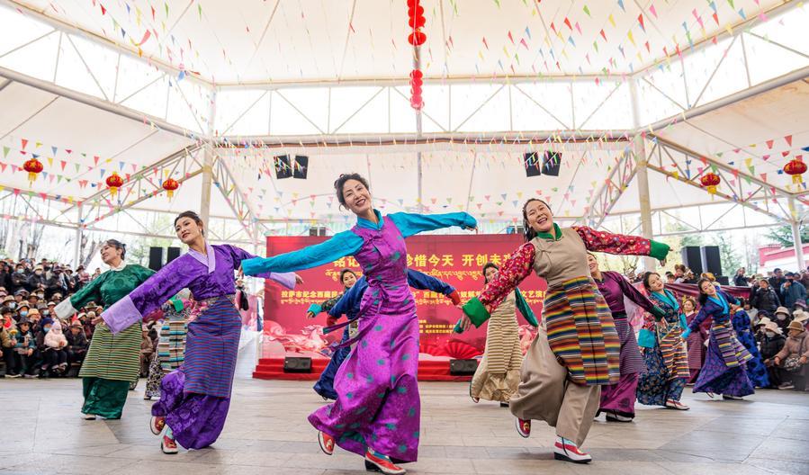 A performance is staged in celebration of the Serfs' Emancipation Day at a park in Lhasa, capital of southwest China's Xizang Autonomous Region, March 28, 2026. (Xinhua/Tenzin Nyida)