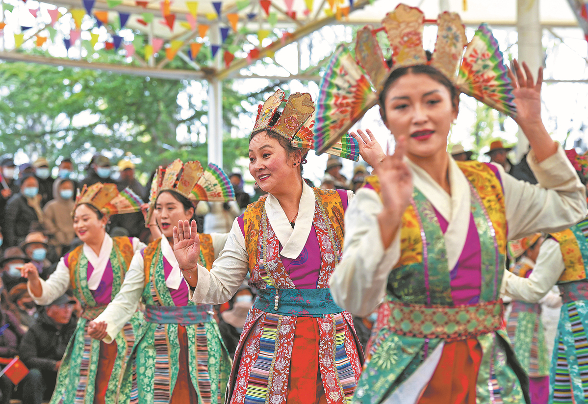 Performers attend a celebration on Saturday in Lhasa, Xizang autonomous region, to mark Serfs’ Emancipation Day. A host of activities were held across the region to commemorate the 67th anniversary of the democratic reform that abolished feudal serfdom in Xizang. Jigme Dorje / XINHUA