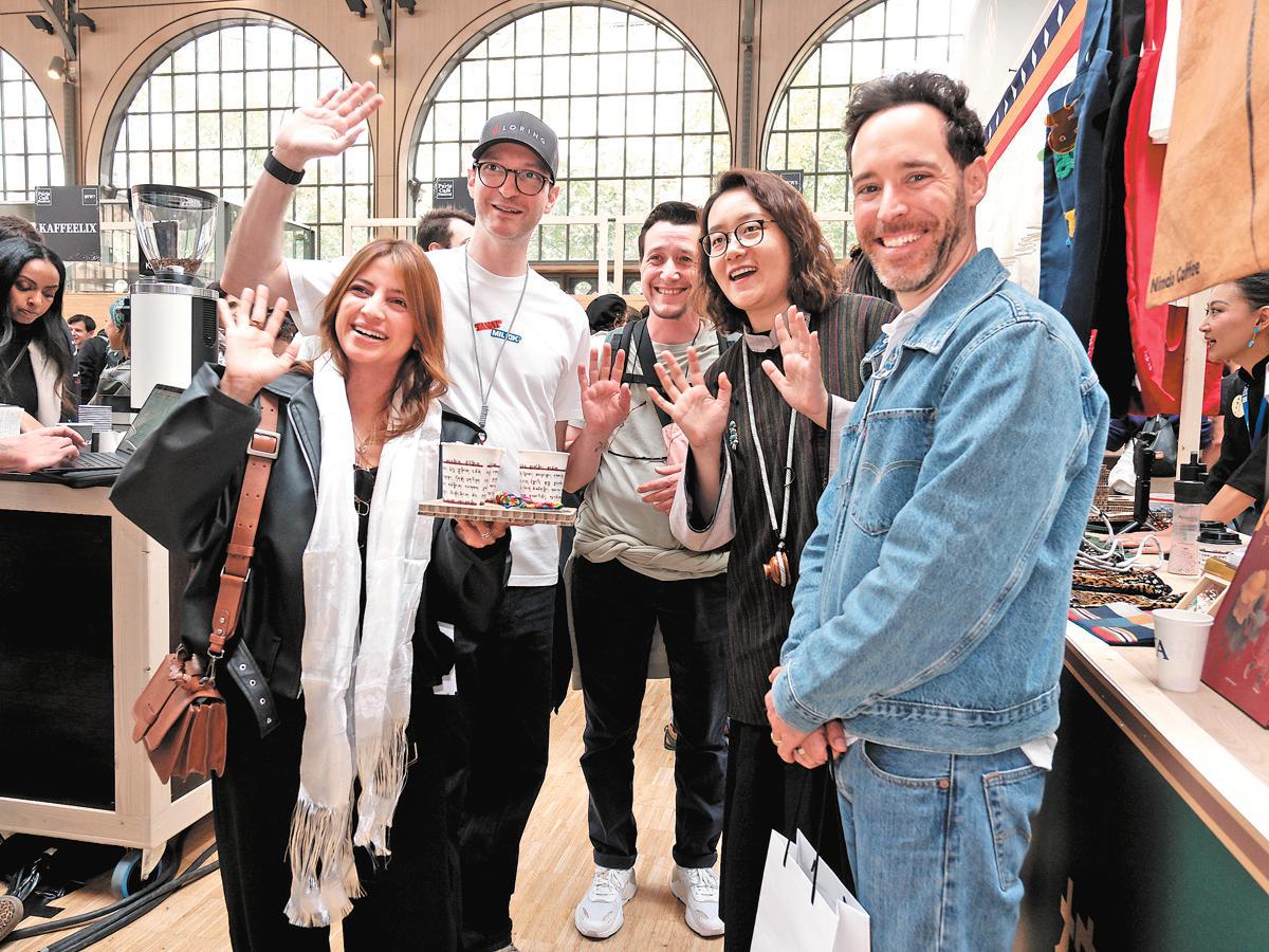 Tsomo (second from right), founder of Nindo Coffee, poses for a photo with French coffee roasters at the Paris coffee festival. CHINA DAILY